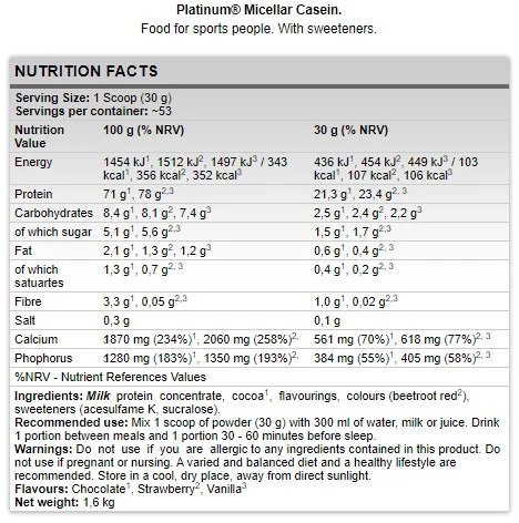 يوفر Platinum Micellar Casein أعلى جودة من الكازين المشتق من الحليب. الكازين هو نوع خاص من البروتين يتمتع بفترة امتصاص طويلة. يؤدي الهضم البطيء للكازين إلى الإطلاق المتوازن للأحماض الأمينية في مجرى الدم (حتى عدة ساعات). علاوة على ذلك، فإن المحتوى العالي من BCAA والجلوتامين في كل جرعة يدعم أيضًا التأثيرات المضادة للتقويض طويلة الأمد. ونتيجة لذلك، يمكن أن يمنع PLATINUM MICELLAR CASEIN عملية تقويض العضلات أثناء فترات الراحة الطويلة بين الوجبات التالية أو يمكن استخدامه كبروتين "ليلي" يدعم ذروة الهرمونات البنائية أثناء النوم.