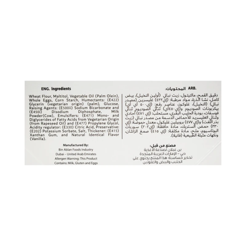 دقيق القمح، زيت نباتي (زيت النخيل)، نشا القمح الكامل، نشا الذرة، محسنات (E422)، الجلوكوز، مستحلبات (E471، E322)، عوامل رفع (E500)، ثنائي الفسفات، سكر، ملح، بروتين حليب، دهون الحليب، مستحلبات، دهون حيوانية، مستحلبات، مستحلبات دهنية (مصدر نباتي)، مستحلبات، مستحلبات دهنية (مصدر نباتي)، مثبتات (E330)، حمض الستريك، مواد حافظة (بوتاسيوم sorbate)، صمغ غوار ونكهة طبيعية (فانيليا).