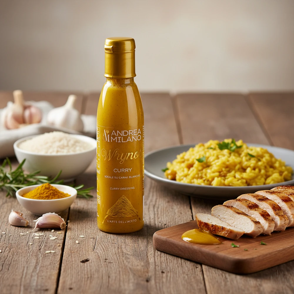 خلّ النبيذ، سكر، كاري مجفف (خليط توابل)، مُثخّن: نشا مُعدّل (E1422).