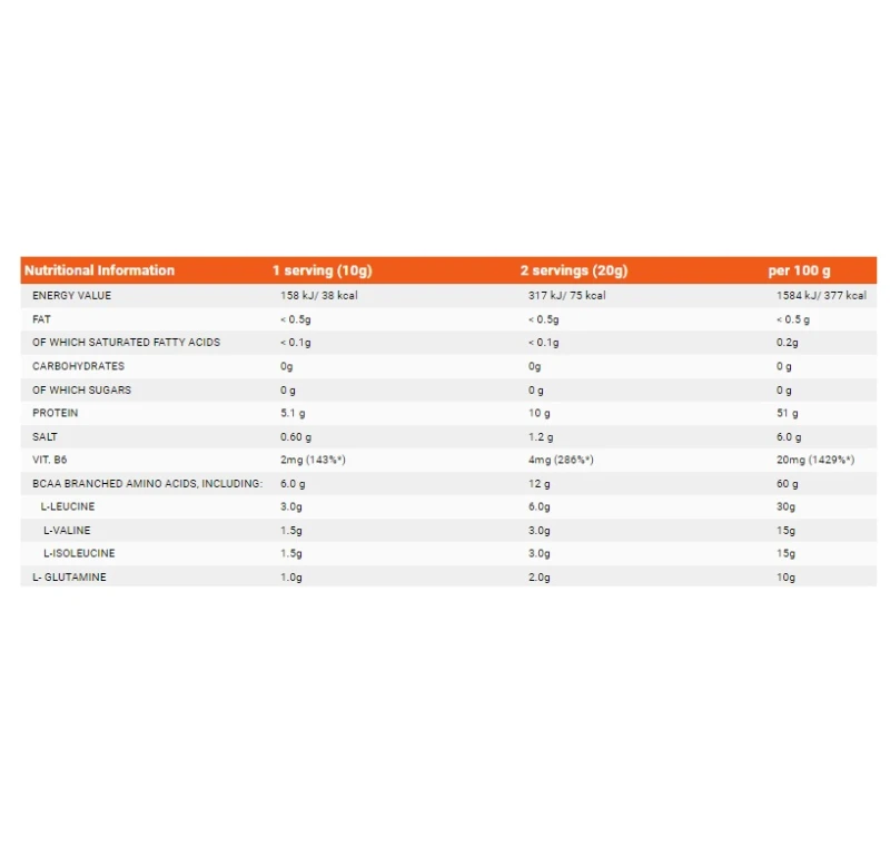 إذا كنت تهتم بتركيبة غنية من الأحماض الأمينية، فإننا نوصي بهذا المنتج! تشتمل تركيبته على أحماض أمينية متفرعة السلسلة BCAA في بنية ميكرونية تضمن قابلية ذوبان ممتازة. والأهم من ذلك، أن الجسم يمتص هذه الأحماض الأمينية جيدًا، مما يمكن أن يساهم في توفير بيولوجي أفضل. بالإضافة إلى ذلك، إذا كنت بصدد اكتساب كتلة عضلية، فإن مزيج الليوسين والفالين والأيسولوسين مع إضافة الجلوتامين وفيتامين ب6 يمكن أن يسرع عملية البناء، ويوقف عضلاتك من التقويض! نوصي بمكونات المنتج لأي شخص لديه خطة يمكن أن يؤدي فيها استخدام الأحماض الأمينية الإضافية إلى تسهيل تنفيذها.