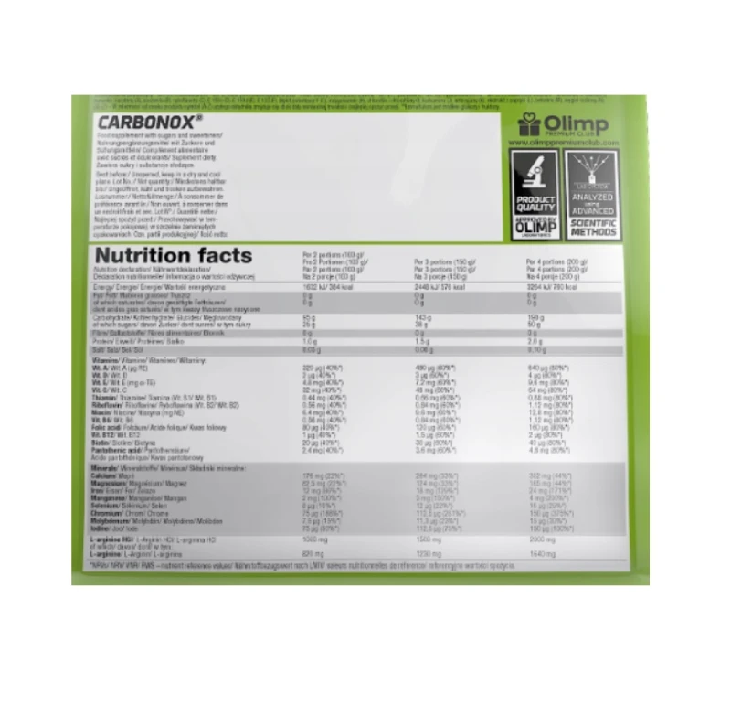 تم أيضًا إثراء Carbonox بمادة L-arginine، المستخدمة كركيزة لتخليق أكسيد النيتريك (NO). مركب مكون من 12 فيتامين من جميع المجموعات الأكثر أهمية يزيد من هضم الكربوهيدرات ويكثف التحويلات الأيضية. علاوة على ذلك، فإن الإمكانات الكبيرة المضادة للأكسدة الموجودة في بعض الفيتامينات تمنع تلف البروتينات الهيكلية من خلايا العضلات في الوقت المحيط بالتمرين، وبالتالي تسريع عملية تجديدها على المستوى الجزيئي.