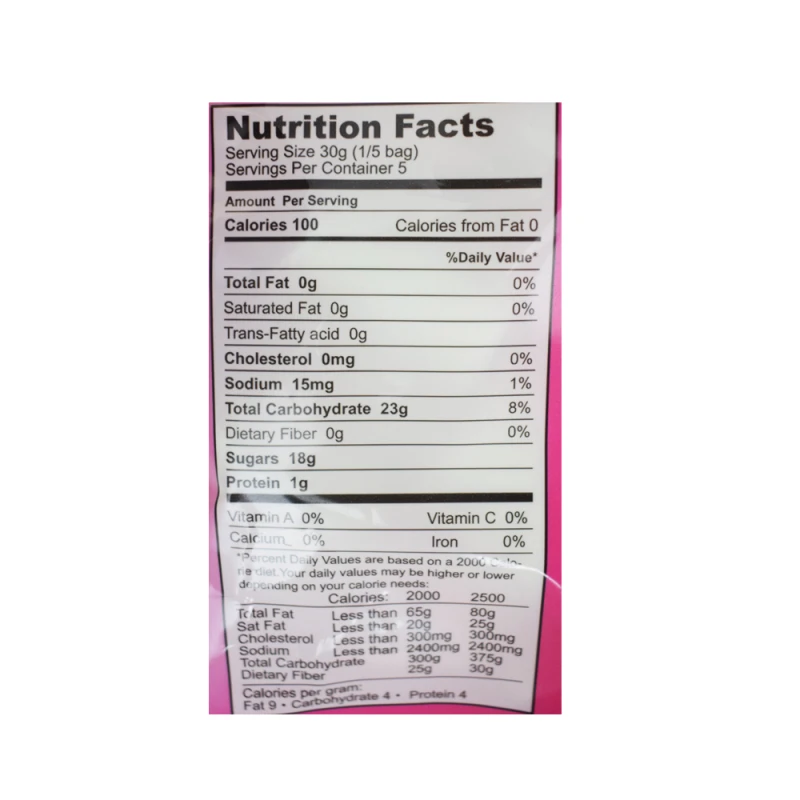 سكر وشراب الذرة وسكر العنب وجيلاتين اللحم البقري (حلال). نشا الذرة ونكهة غذائية ولون غذائي E129.