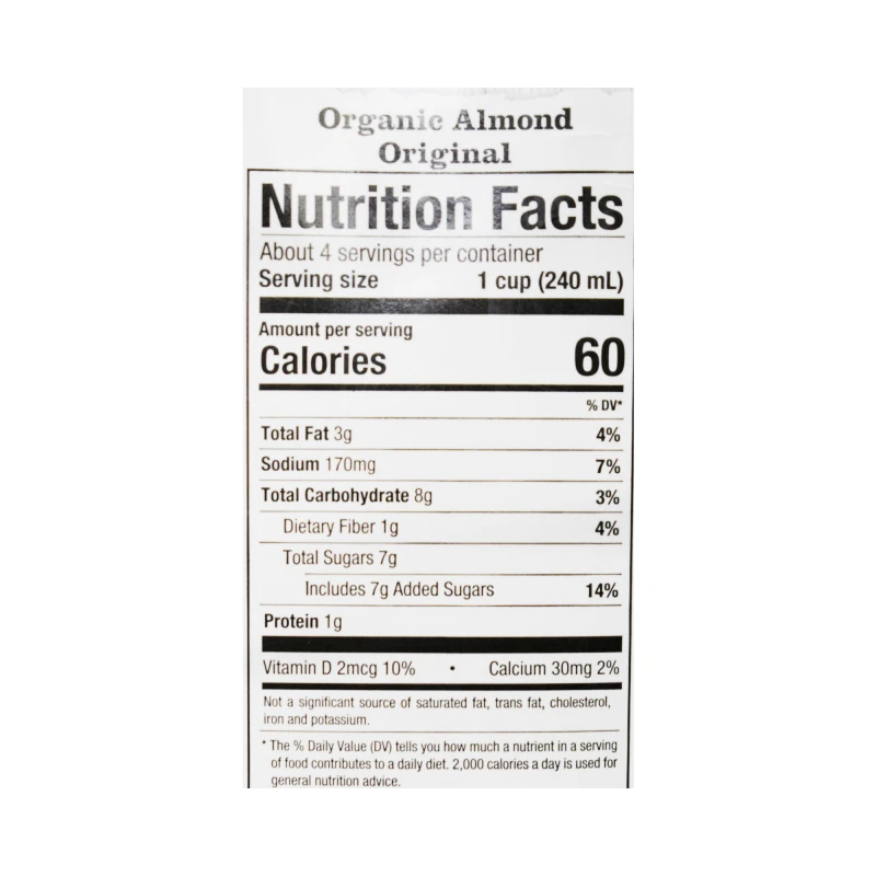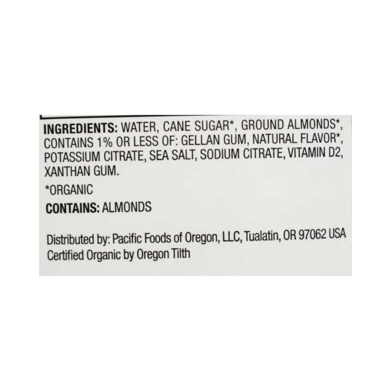 قاعدة اللوز * (ماء مصفى ، لوز *) ، قصب مجفف ، شراب * ، سترات البوتاسيوم ، ملح البحر ، كاراجينان ، ريبوفلافين (ب 2) ، فيتامين أ بالميتات ، فيتامين د 2.
