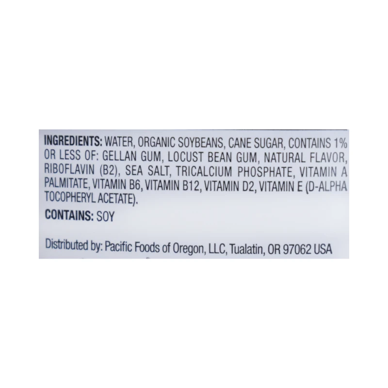 قاعدة فول الصويا * (ماء ، فول صويا كامل *) ، شراب قصب مجفف ، نكهات طبيعية ، فوسفات ثلاثي الكالسيوم ، ملح البحر ، كاراجينان ، ريبوفلافين (ب 2) ، فيتامين هـ (د-ألفا توكوفيرول أسيتات) ، فيتامين د 2 ، فيتامين ب 6 ( بيريدوكسين هيدروكلورايد)، فيتامين أ (بالميتات)، فيتامين ب 12.