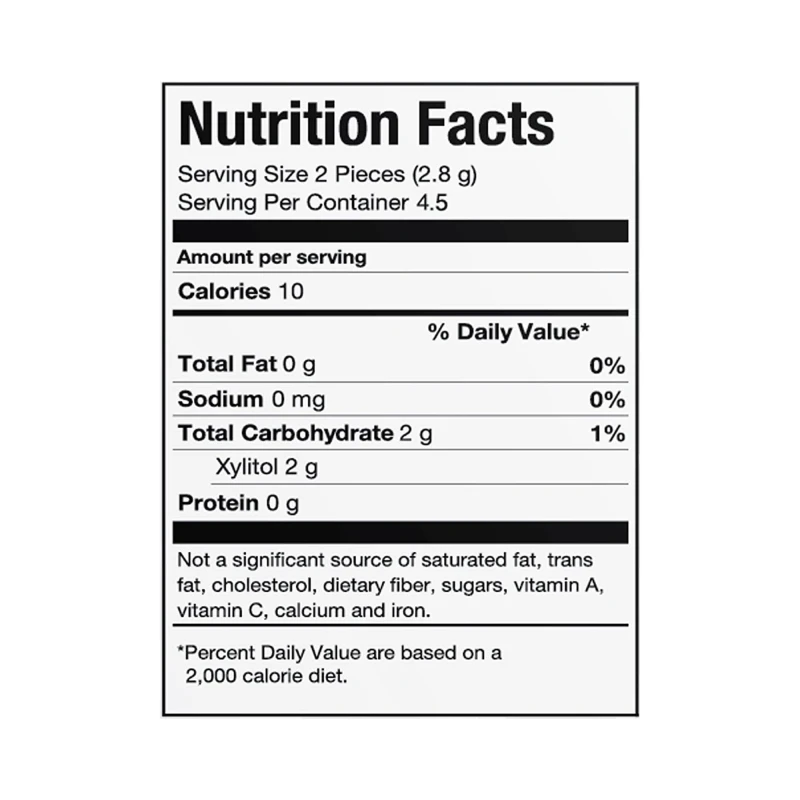 زيليتول، قاعدة علكة، صمغ عربي، نكهات طبيعية، غليسرول، شمع الكارنوبا، توكوفيرول. (الاستهلاك المفرط قد يؤدي إلى مفعول ملين).