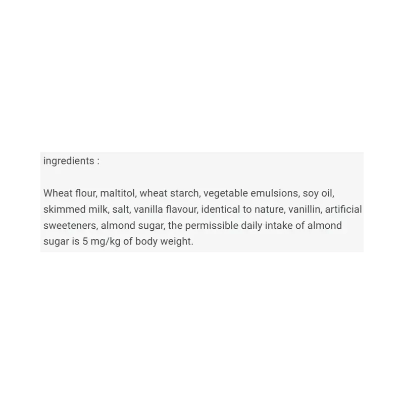 دقيق القمح مالتيتول نشاء القمح مستلبات نباتية زيت صويا , حليب منزوع القشطة , ملح نكهة الفانيلا المماثلة للطبيعة , فانيلين مواد تحلية اصطناعية, سكر الوز , الكمية المسموح بتناولها يوميا من السكر الوز5 ملجم/ كلجم من وزن الجسم .