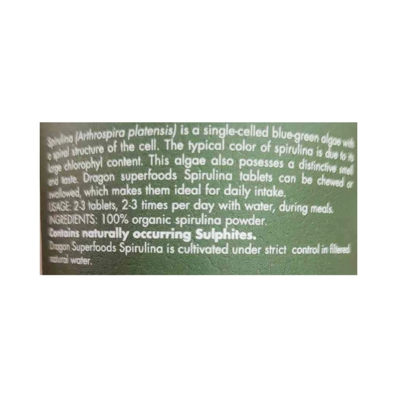 سبيرولينا (أرثروسبيرا بلاتنسيس) هي طحالب خضراء زرقاء أحادية الخلية ذات بنية حلزونية للخلية. اللون النموذجي للسبيرولينا يرجع إلى محتواه الكبير من الكلوروفيل. تمتلك هذه الطحالب أيضًا رائحة وطعمًا مميزًا. يمكن مضغ أو ابتلاع أقراص Dragon Superfoods Spirulina، مما يجعلها مثالية لتناولها يوميًا.