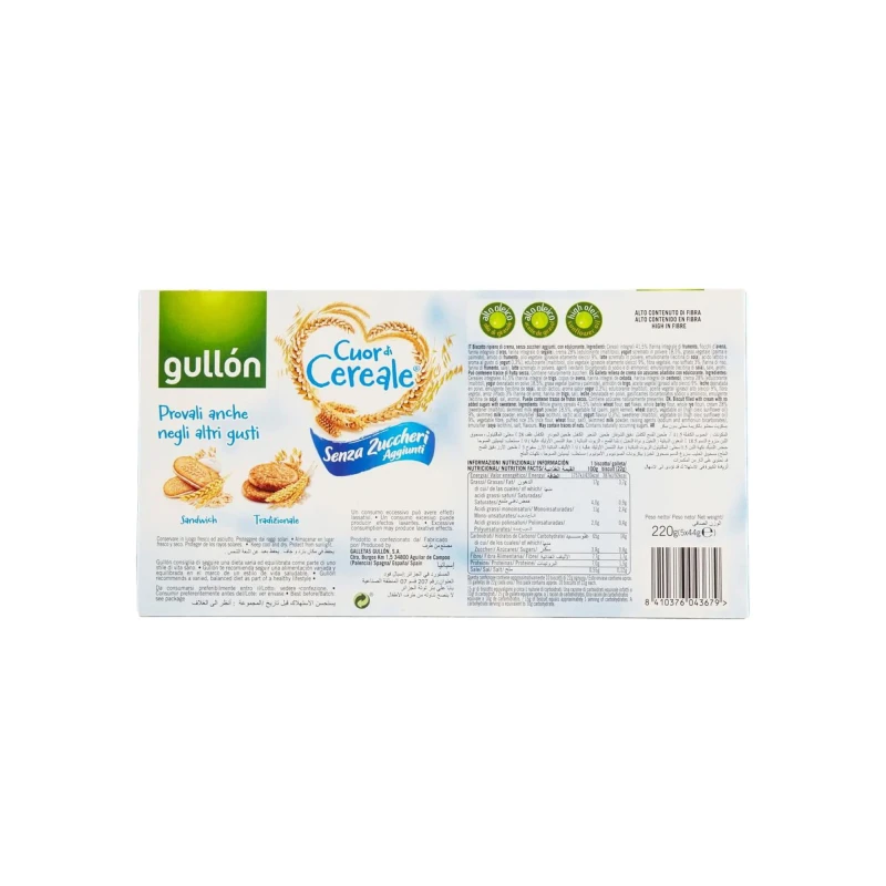 المكونات: بسكويت مع حشوة محلى بدون سكر مضاف: دقيق القمح 35%، حشوة 28% [محلي (مالتيتول)، زيوت ودهون نباتية (دوار الشمس عالي الأوليك، الشيا)، مسحوق حليب منزوع الدسم، مستحلب (ليسيثين الصويا)، محسن النكهة (حمض اللاكتيك)]، محلي (مالتيتول)، حبوب كاملة 10% (رقائق الشوفان، دقيق الشعير الكامل، دقيق الجاودار الكامل)، زيت نباتي (دوار الشمس مع نسبة عالية من حمض الأوليك) 9%، ألياف نباتية، أرز منتفخ 3% (دقيق الأرز، دقيق القمح، ملح)، مسحوق حليب منزوع الدسم، مخمر (كربونات الصوديوم، كربونات حمض الأمونيوم)، ملح، نكهات اصطناعية. ملاحظات هامة من العبوة: قد يحتوي المنتج على آثار من المكسرات والخردل، يحتوي على سكر طبيعي (الموجود في الحليب والحبوب)، والاستهلاك المفرط للمحليات (المالتيتول) قد يؤدي إلى آثار ملينة (إسهال بسيط)، الوزن الكلي: 220 جرام (يحتوي على 5 مغلفات، كل مغلف به قطعتين بسكويت، بإجمالي 10 قطع).