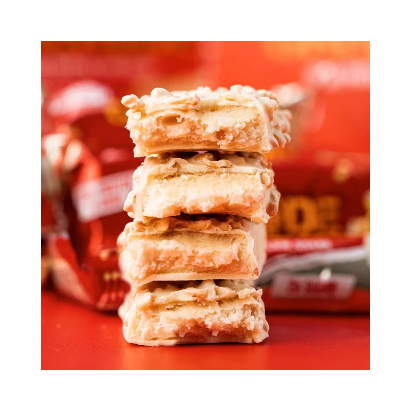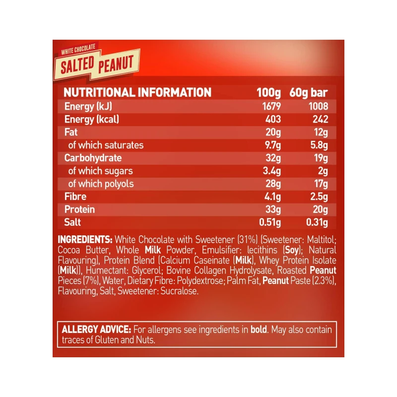 شوكولاتة بيضاء مع محلي (31%) (محلي: مالتيتول، زبدة الكاكاو، مسحوق الحليب كامل الدسم، مستحلب: ليسيثين (فول الصويا)، نكهة طبيعية)، مزيج البروتين (كازينات الكالسيوم (الحليب)، معزول بروتين مصل اللبن (الحليب))، مرطب: الجلسرين. هيدروليسات الكولاجين البقري، قطع الفول السوداني المحمصة (7٪)، الماء، الألياف الغذائية: بولي دكستروز؛ دهن النخيل، معجون الفول السوداني (2.3%)، منكهات، ملح، محلي: سكرالوز.