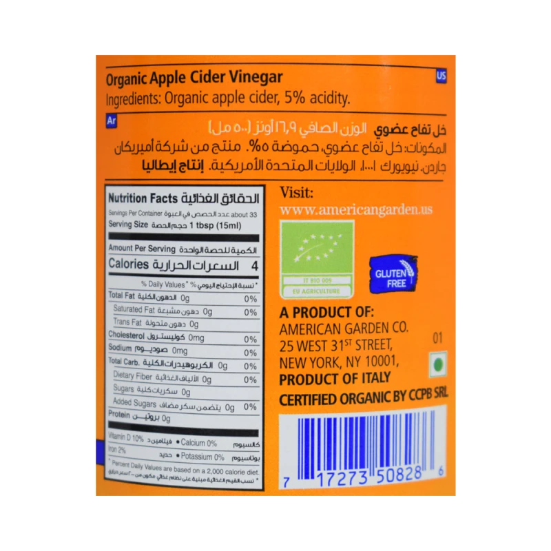 خل التفاح من أميريكان جاردن طبيعي وعضوي ، مصنوع من تفاح لذيذ ومُزرع عضوياً.