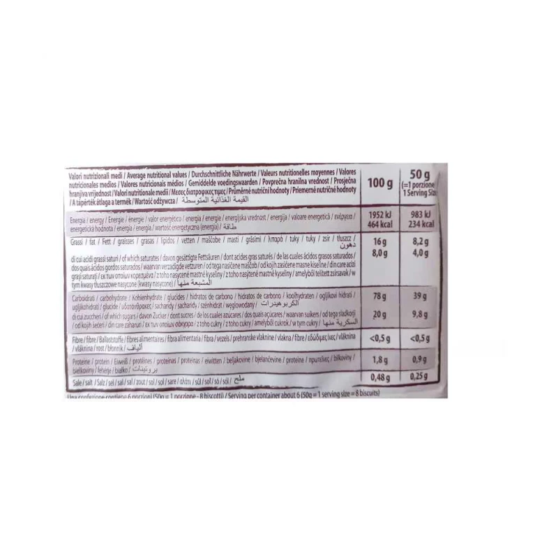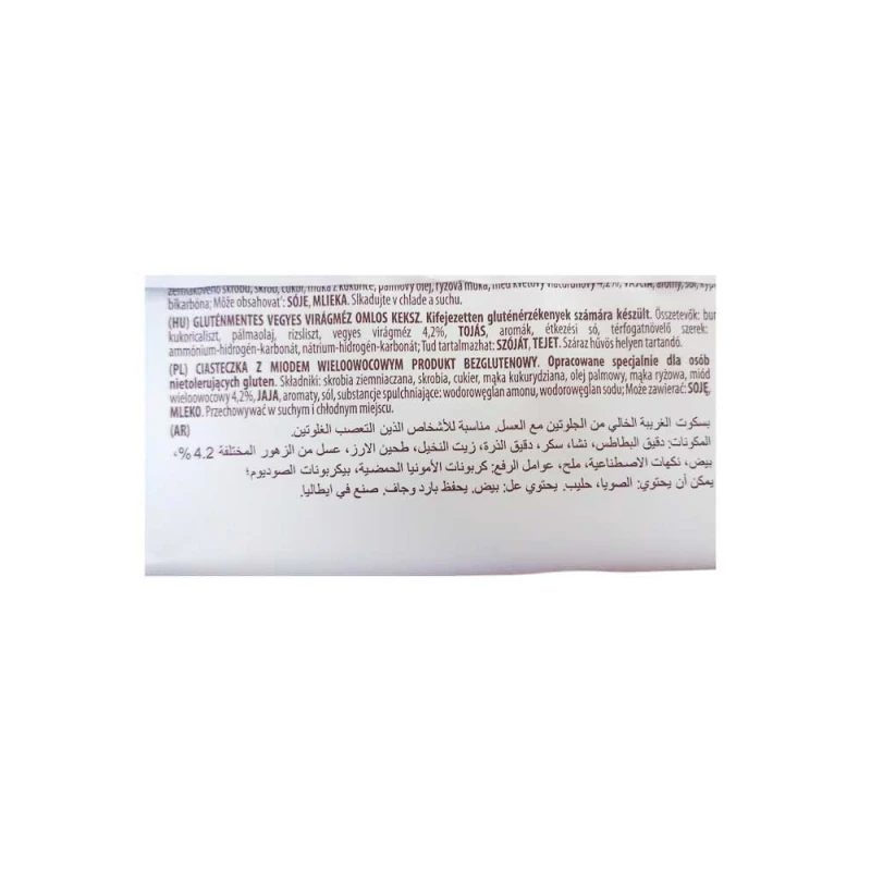 نشا البطاطس ، نشا ، دقيق الذرة ، سكر ، زيت دوار الشمس 15.6٪ ، دقيق أرز ، عسل ميلفيوري 4.2٪ ، بيض ، مسحوق حليب كامل الدسم ، نكهات ، ملح ، عوامل تخمير: كربونات حمض الأمونيوم ، كربونات حمض الصوديوم. مضادات الأكسدة: مستخلص إكليل الجبل. قد تحتوي على آثار من: فول الصويا.