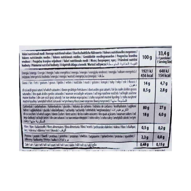 طاقة 1920 كيلو جول طاقة 456 كيلو كالوري دهون 14 جرام منها أحماض دهنية مشبعة 8.5 جرام كربوهيدرات 80 جرام منها سكريات 22 جرام ألياف أقل من 0.5 جرام بروتين 2.3 جرام ملح 0.55 جرام