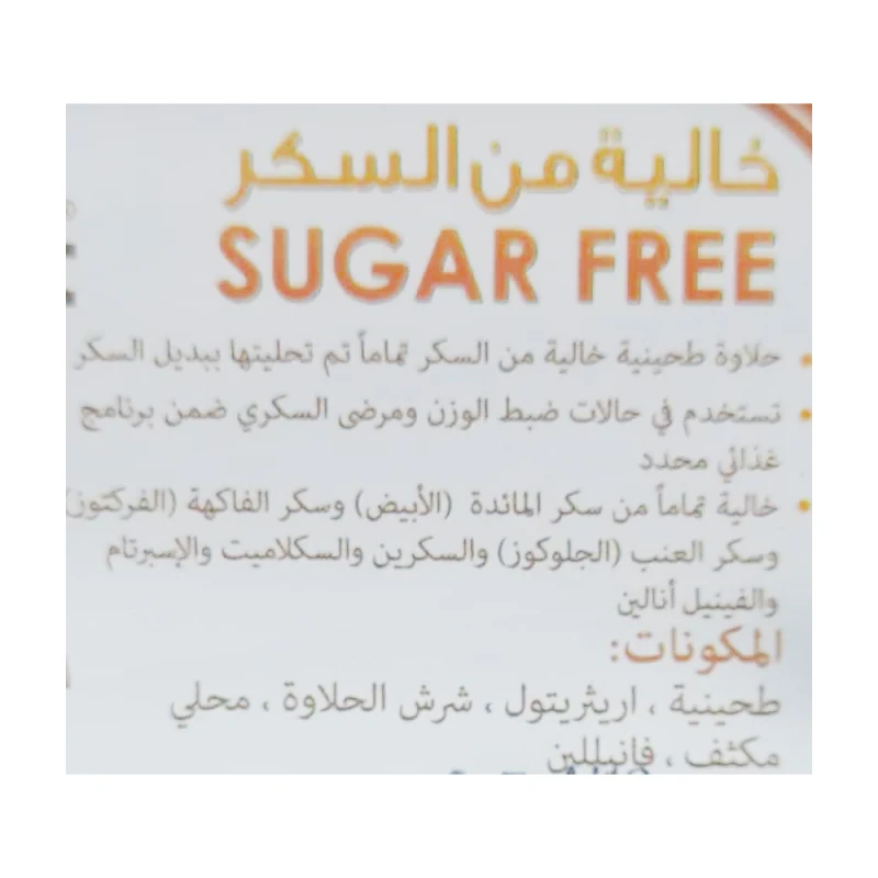 المكونات: طحينية، محلي لايت آند سويت (إريثريتول ، سكرلوز) ، إنولين، شرش الحلاوة، مثبت، نكهة فانيلا.