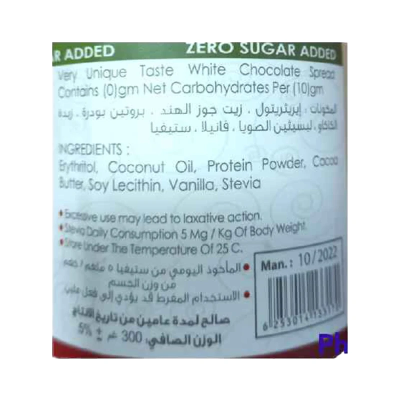 المكونات: محلي لايت آند سويت ( إريثريتول ، سكرلوز ) إنولين ، زيت نباتي ، بودرة الحليب ، بروتين الحليب، بودرة الكاكاو ، ليسيثين الصويا ، فانيلا .