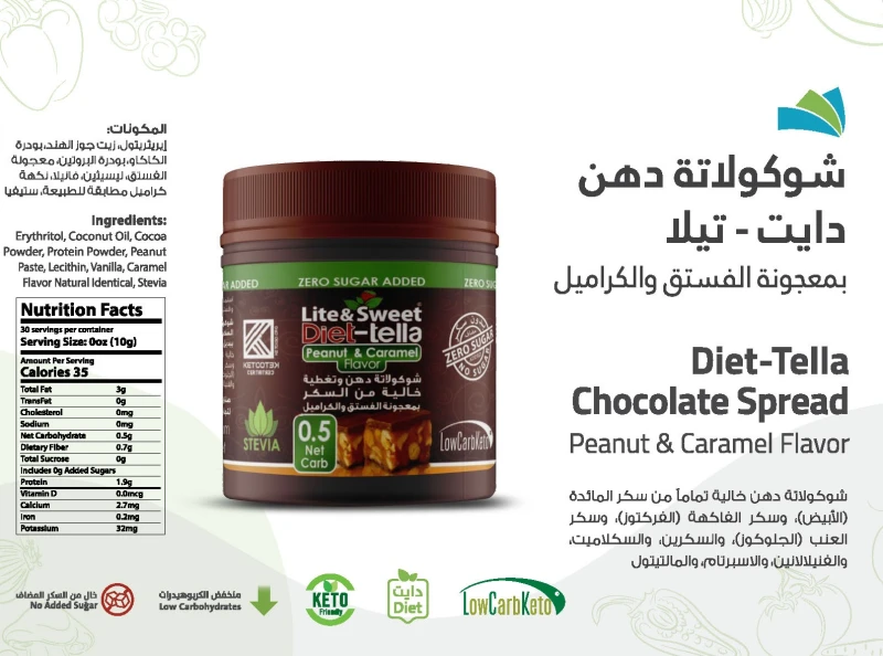المكونات: محلي لايت آند سويت ( إريثريتول ، سكرلوز ) إنولين ، زيت نباتي ، بودرة الحليب ، بروتين الحليب، بودرة الكاكاو ، معجونة الفول السوداني، ليسيثين الصويا ، نكهة الكرميل ، فانيلا .