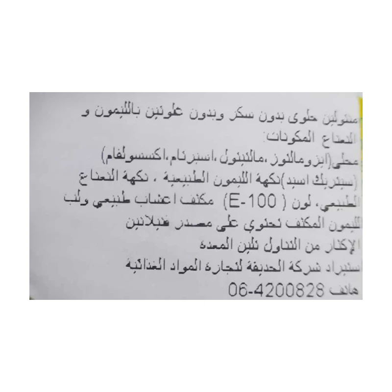 المُحليات (إيزومالتوز ، مالتيتول ، أسبارتام ، أسيسولفام- ك) ، حامض (حمض الستريك) ، نكهة الليمون الطبيعية ، اللون (E-100) ، مستخلص أعشاب طبيعية ، نكهة المنثول الطبيعية وخلاصة بلسم الليمون الطبيعي.