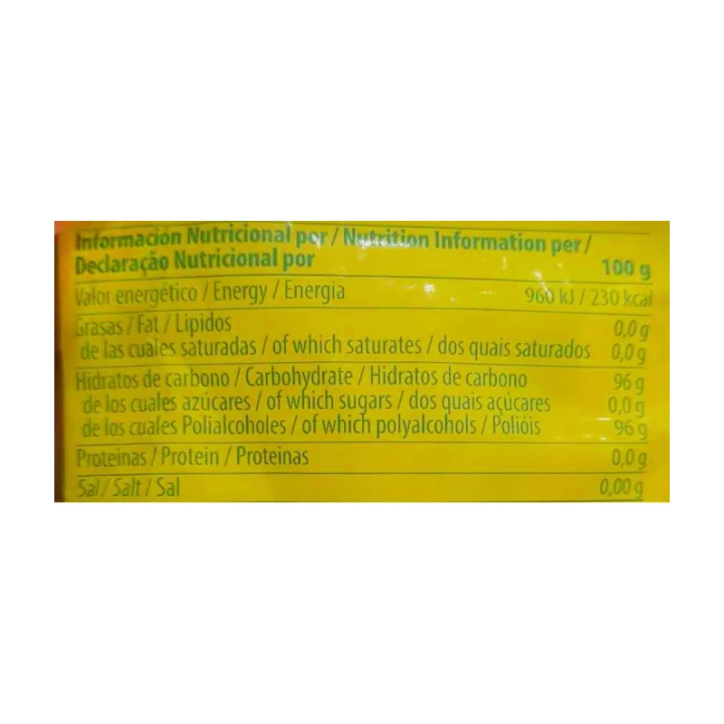 قيمة الطاقة: 960 كيلو جول · قيمة الطاقة: 230 كيلو كالوري · الدهون: 0 جرام · المشبعة: 0 جرام · الكربوهيدرات: 96.0 جرام · منها السكريات: 0 جرام · الألياف الغذائية: 0 جرام بروتين: 0 جرام ملح: 0 جرام