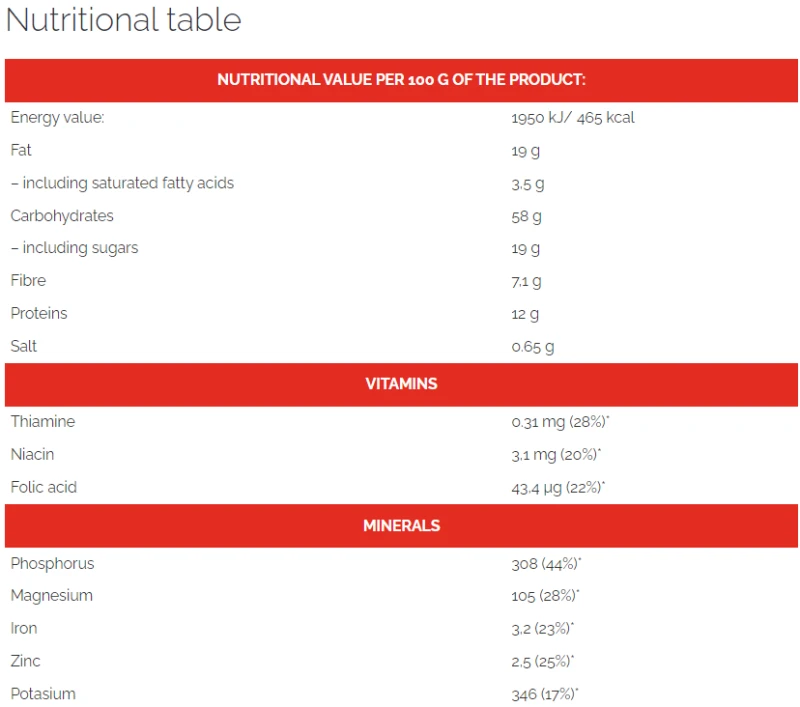 رقائق الشوفان الحبوب الكاملة 36,5%، الدقيق: الشوفان 7%، الشعير، الذرة؛ سكر القصب غير المكرر، الفول السوداني 9,4%، زيت عباد الشمس، كريمة الفول السوداني 5,2%: الفول السوداني؛ جريش الذرة، رقائق جوز الهند، دبس القصب، ملح البحر، عامل رافعة: كربونات الصوديوم، مستحلب: ليسيثين (فول الصويا)، مستخلص شعير الشعير.