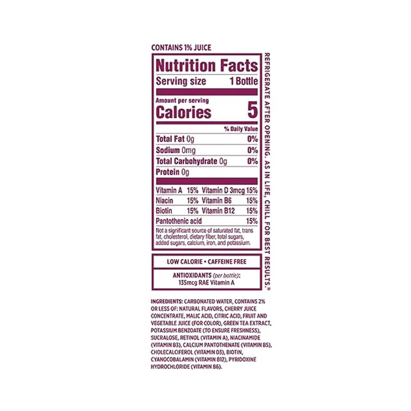 المياه الغازية ، النكهات الطبيعية ، مركز عصير التفاح ، حمض الماليك ، مركز عصير الكرز ، بنزوات البوتاسيوم (لضمان النضارة) ، حمض الستريك ، سكرالوز ، أحمر 40 ، مستخلص الشاي الأخضر ، البيوتين 1٪ تريت ، (مالتوديكسترين) ، نياسيناميد (ب 3) ) ، د-كالسيوم بانتوثينات (ب 5) ، فيتامين ب 12 0.1٪ (مانيتول) ، فيتامين د 3 ، بيريدوكسين هيدروكلوريد (ب 6) ، أزرق 1.