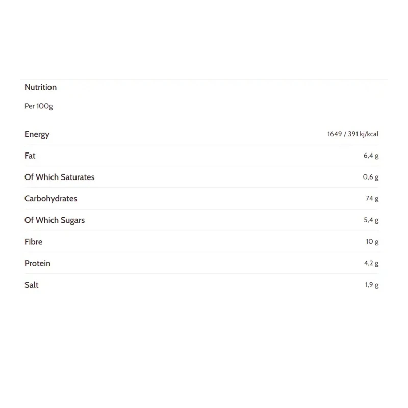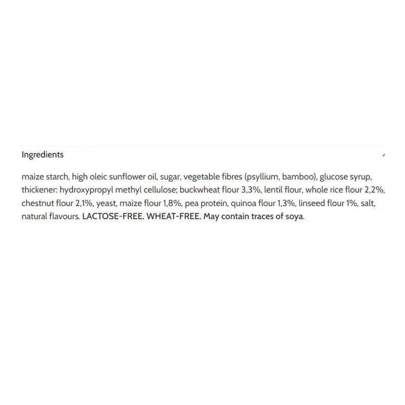 نشا الذرة ، زيت عباد الشمس عالي الأوليك ، سكر 6٪ ، ألياف نباتية (سيلليوم ، بامبو) ، شراب جلوكوز 5٪ ، مثخن: هيدروكسي بروبيل ميثيل سليلوز ؛ دقيق الحنطة السوداء 3.3٪ ، دقيق العدس ، دقيق الأرز الكامل 2.2٪ ، دقيق الكستناء 2.1٪ ، الخميرة ، دقيق الذرة 1.8٪ ، بروتين البازلاء ، دقيق الكينوا 1.3٪ ، دقيق بذر الكتان 1٪ ، ملح ، نكهات طبيعية. خالي من اللاكتوز (اللاكتوز <0.007 جم / 100 جم). خالي من الغلوتين