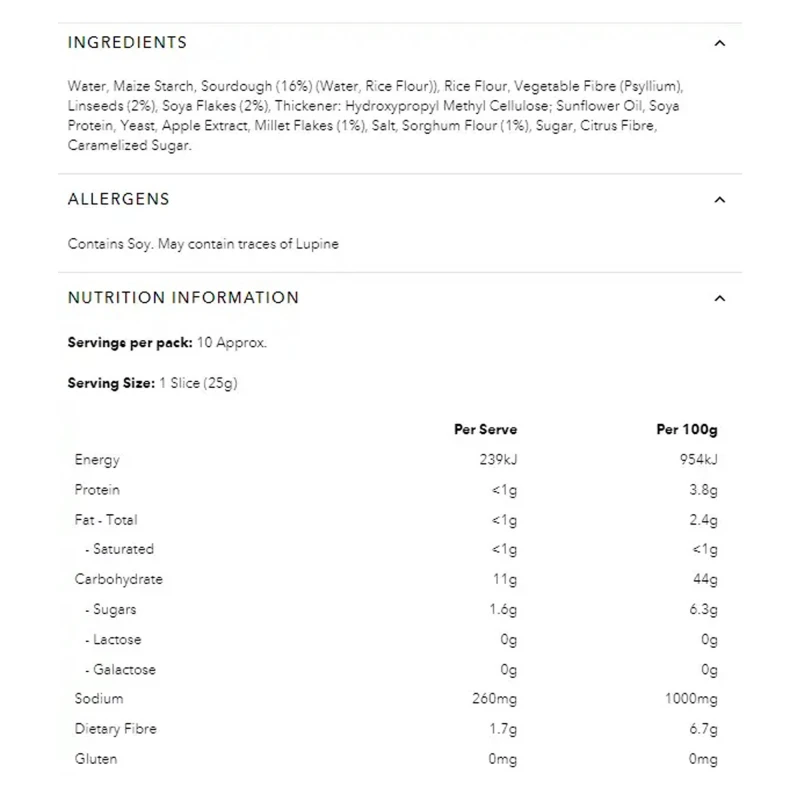 ماء، نشا الذرة، عجين مخمّر (دقيق الأرز، ماء) 14%، دقيق الأرز، ألياف نباتية (السيليوم، الحمضيات)، رقائق الصويا 1.9%، بذور الكتان 1.8%، مادة مُكثِّفة: هيدروكسي بروبيل ميثيل سليلوز، زيت دوار الشمس، بروتين الصويا، خميرة، مستخلص التفاح، رقائق الدخن 1%، ملح، دقيق الذرة الرفيعة 0.8%، سكر، نكهة طبيعية.قد يحتوي على الترمس والخردل.خالٍ من اللاكتوز