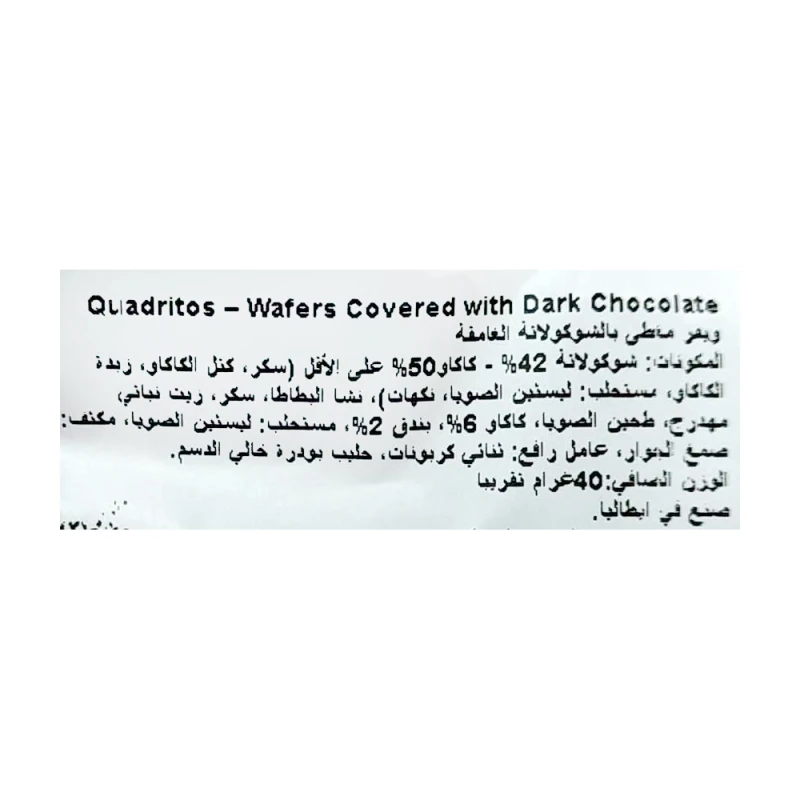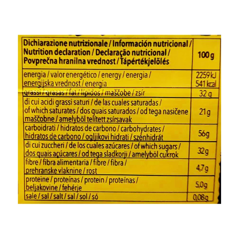 شوكولاتة داكنة (42٪) تحتوي على سكر، كتلة الكاكاو، زبدة الكاكاو، مستحلب: ليسيثين الصويا، نكهة طبيعية، نشا البطاطس، سكر، زيوت نباتية (نخيل، نواة النخيل)، كاكاو (5٪)، بندق (2٪)، دقيق الصويا، مستحلب: ليسيثين الصويا، مثخن: صمغ الغوار، عامل رفع: بيكربونات الصوديوم، حليب منزوع الدسم بودرة.