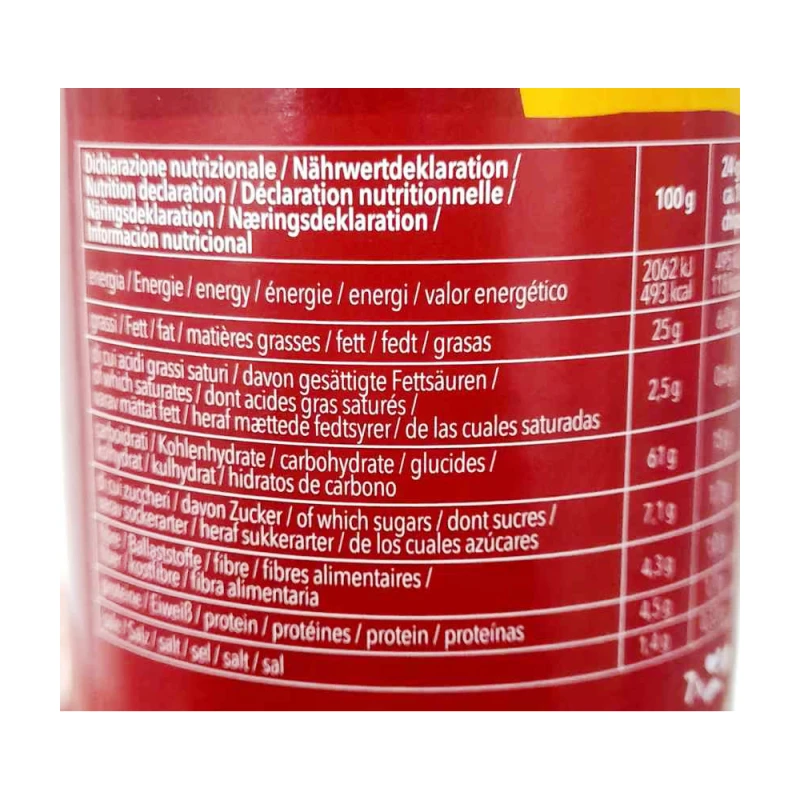 بطاطس مجففة ‎56%‎، زيت دوّار الشمس، دقيق الأرز، شراب الجلوكوز، نشا البطاطس، سكر، ملح منخفض الصوديوم، مستحلب: أحادي وثنائي الجليسريد من الأحماض الدهنية؛ زيت الكانولا، ملح، مسحوق الفلفل الحلو، نكهة طبيعية، مسحوق الطماطم، مسحوق الفلفل الحلو المدخن، مسحوق البصل، مسحوق الثوم، مضاد أكسدة: حمض الأسكوربيك؛ منظم حموضة: حمض الستريك؛ مسحوق الفلفل الحلو المدخن.قد يحتوي على آثار من الحليب.