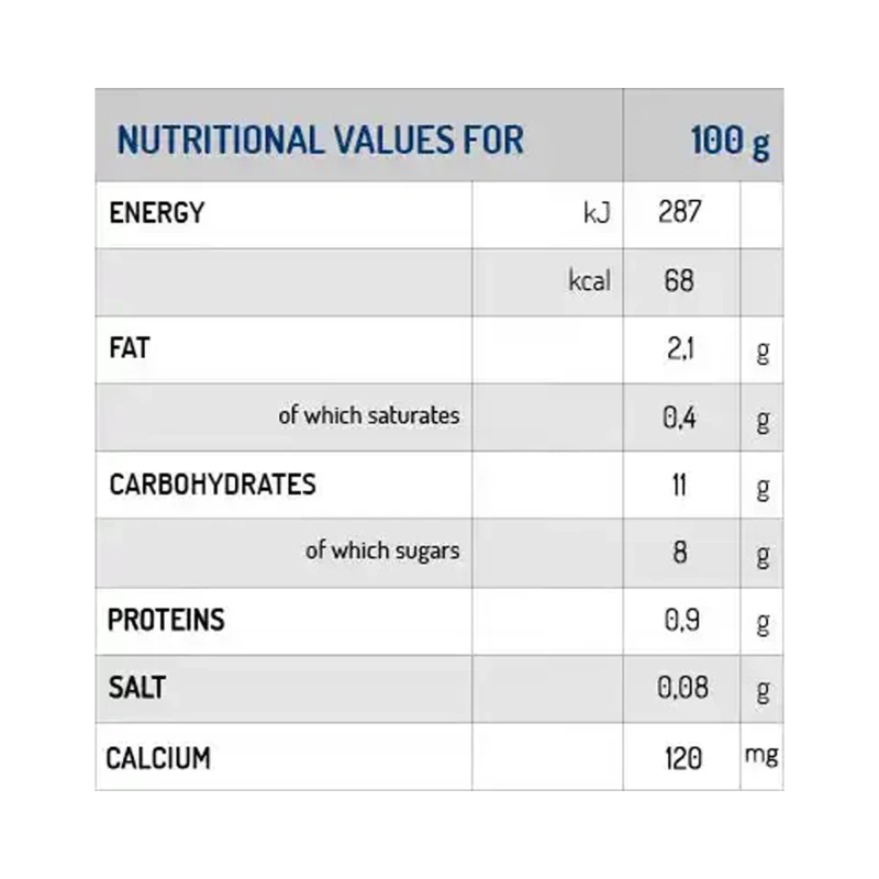 ماء، أرز عضوي (16%)، مسحوق الكاكاو العضوي (1,5%)، شراب الصبار العضوي (1%)، زيت الأرز، مثبتات: الكاراجينان، صمغ الزانثان؛ ملح.