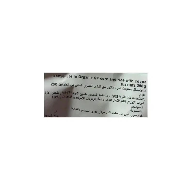 33% نشا الذرة*، سكر القصب*، زيت دوار الشمس عالي الزيت*، 14% دقيق الذرة*، 9% دقيق الأرز*، شراب الأرز*، 2.5% كاكاو*، كربونات الأمونيوم، كربونات الصوديوم، نكهة طبيعية*