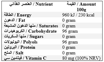 إيزومالت، شراب المالتيتول، مرطب الجليسرين، حمض الستريك، مستخلص عشبي (البارو، السرعوف، الحلنتيت، اليانسون، القرنفل، الجنتين، الخطمي، المروبيون، النعناع، الموز الجنة، زهرة الربيع، المريمية، البلسان، الزعتر)، نكهة الليمون الطبيعية، نكهات طبيعية، مستخلص نباتي (التفاح، الزعفران والليمون)، المحليات: أسيسولفام ك، السكرالوز، فيتامين ج (حمض الأسكوربيك)، مستخلص سبيرولينا.