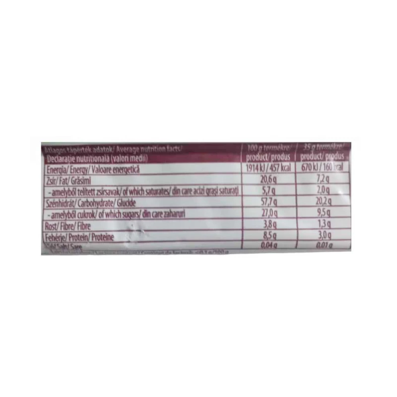 شراب الجلوكوز - الفركتوز ، رقائق الحبوب المبثوقة (دقيق الذرة ، السكر) ، الفول السوداني 10.6٪ ، السكر ، بذور اليقطين 7.1٪ ، بذور عباد الشمس 6.7٪ ، بذور الكتان 6.4٪ ، مالتوديكسترين ، دهن نباتي (نخيل) ، شراب جلوكوز ، خوخ 3.9 ٪ ، (برقوق 85٪ ، دكستروز) ، قطع تفاح مجففة 1.1٪ (تفاح 85٪ ، دكستروز) ، مرطب: سوربيتول ، مستحلب: ليسيثين الصويا ، منظم حموضة: حمض الماليك ، رائحة. قد يحتوي المنتج على مكسرات وبذور سمسم وبروتين حليب!