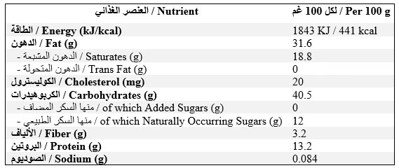 يحتوي على الصويا والحليب. قد يحتوي على البندق واللوز وجوز البيكان والفستق الحلبي والفول السوداني والمكسرات الأخرى