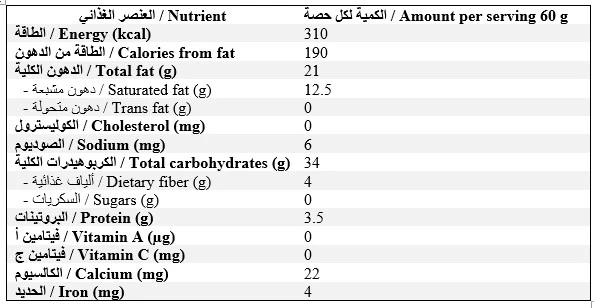 المكونات: زبدة كاكاو 25% , عجينة كاكاو 45% ، مالتيتول، بندق ، ليسيثين الصويا، فانلين