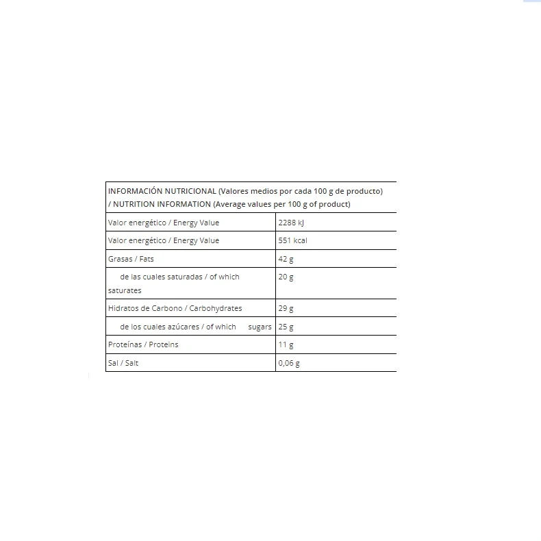 معجون الكاكاو، السكر، اللوز (20٪)، مسحوق الكاكاو قليل الدسم، زبدة الكاكاو، مستحلب (ليسيثين الصويا) ونكهات. الكاكاو: 70% كحد أدنى. قد تحتوي على مكسرات وحليب أخرى. خالي من الغلوتين.