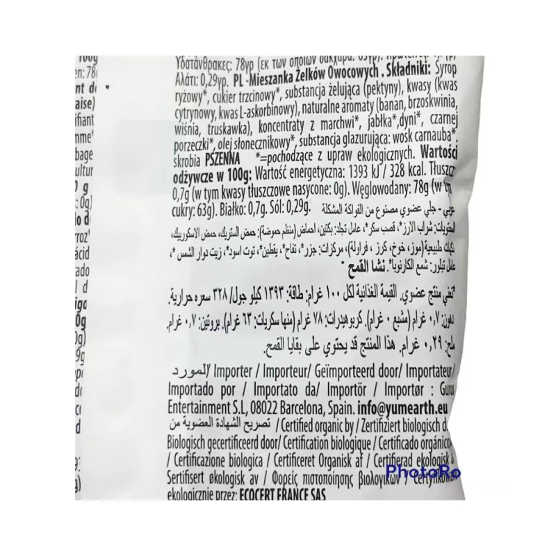 شراب أرز عضوي ، شراب سكر عضوي ، بكتين ، حمض الستريك ، حمض الأسكوربيك ، نكهات طبيعية ، لون مركز عضوي (تفاح ، جزر ، قرع ، كشمش أسود) ، زيت دوار الشمس العضوي ، شمع كرنوبا عضوي.