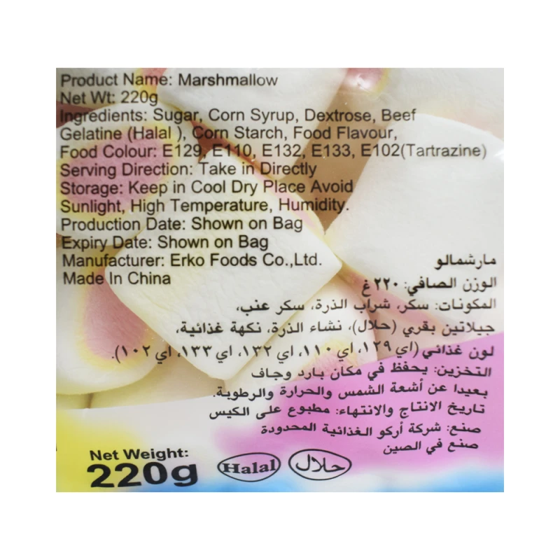 سكر وشراب الذرة وسكر العنب وجيلاتين اللحم البقري (حلال). نشا الذرة ونكهة غذائية ولون غذائي اي ١٢٩ . اي ١١٠ اي ١٣٢ اي ١٣٣ اي ١٠٢