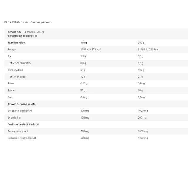 الفوائد: زيادة الوزن والكتلة العضلية وزيادة عملية الاستشفاء العضلي. القيمة الغذائية: 56 غرام بروتين، 252 غرام كربوهيدرات، 10.2 غرام بي سي ايه ايه و 5 غرام كرياتين. عدد الحصص: 15 حصة