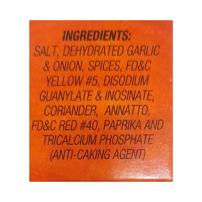 ملح، ثوم وبصل مجفف، توابل، أصفر FD&C رقم 5، غوانيلات وأينوزينات ثنائي الصوديوم، كزبرة، أناتو، أحمر FD&C رقم 40، فلفل بابريكا، وثلاثي فوسفات الكالسيوم (كمادة مانعة للتكتل).