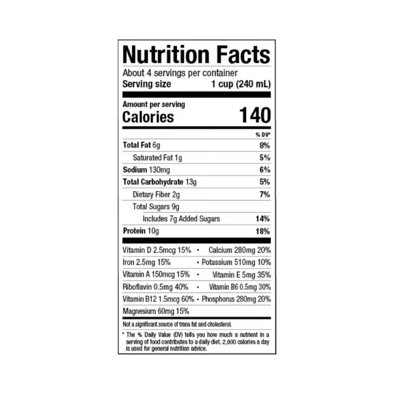 قاعدة فول الصويا * (ماء ، فول صويا كامل *) ، شراب قصب مجفف ، نكهات طبيعية ، فوسفات ثلاثي الكالسيوم ، ملح البحر ، كاراجينان ، ريبوفلافين (ب 2) ، فيتامين هـ (د-ألفا توكوفيرول أسيتات) ، فيتامين د 2 ، فيتامين ب 6 ( بيريدوكسين هيدروكلورايد)، فيتامين أ (بالميتات)، فيتامين ب 12.