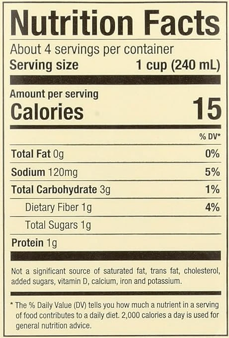 المكونات: الماء، مركز عصير الجزر العضوي، مركز عصير الكرفس العضوي، الثوم العضوي، مركز عصير الكراث العضوي، مركز عصير البصل العضوي، معجون الطماطم العضوي، ملح البحر، مركز عصير الفطر العضوي، التوابل العضوية، خل التفاح العضوي.