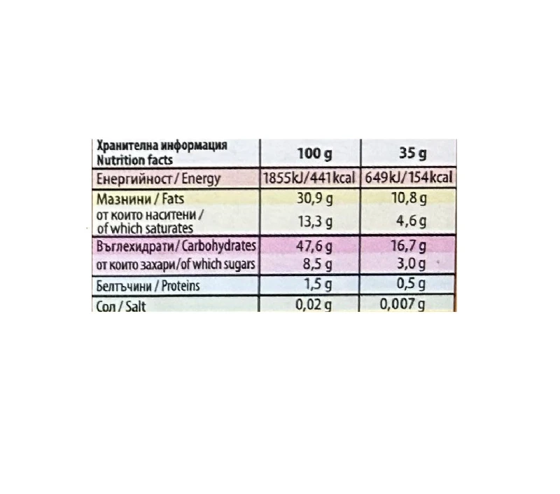 * عربي: زيوت نباتية (نخيل)، مالتوديكسترين، مسحوق مصل اللبن، دقيق القمح أبيض نوع 500 (مانيتول)، مسحوق حليب خالي الدسم، محلي: ستيفيا، مسحوق كاكاو، مستحلب: ليسيثين الصويا، منظم حموضة: حمض الستريك، عامل رفع: كربونات هيدروجين الصوديوم،