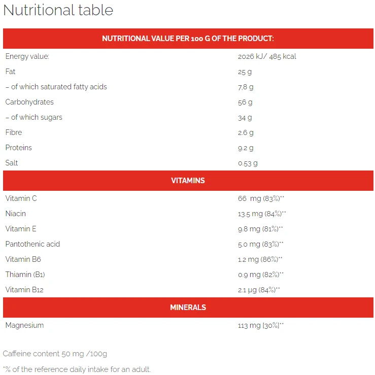 الفول السوداني 25,5%، شوكولاتة الحليب 25% (سكر، زبدة الكاكاو، مسحوق الحليب كامل الدسم، كتلة الكاكاو، دهن الحليب اللامائي، مستحلب: الليسيثين (فول الصويا)؛ نكهة الفانيليا الطبيعية)، شراب الجلوكوز، دقيق: أرز، ذرة؛ مرطبات: الجلسرين. مالتوديكسترين، سكر قصب غير مكرر، زيت دوار الشمس، كراميل 2,4% (شراب الجلوكوز، سكر)، مسحوق حليب منزوع الدسم، ملح البحر، نكهات طبيعية، مستحلب: ليسيثين (صويا)؛ مواد غنية: سترات المغنيسيوم، فيتامين ج، النياسين، فيتامين ه، حمض البانتوثنيك (ب5)، فيتامين ب6، الثيامين (ب1)، فيتامين ب12؛ مستخلص الجوارانا 0,5% (مالتوديكسترين، مستخلص الجوارانا الطبيعي، الكافيين الطبيعي 0,05%).