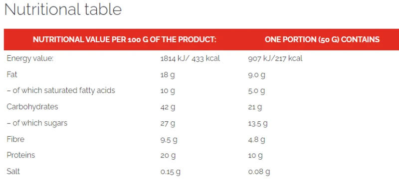 شوكولاتة 25% (كتلة الكاكاو، سكر، زبدة الكاكاو، مستحلبات: ليسيثين (صويا)، E492؛ نكهة الفانيليا الطبيعية)، مركز بروتين مصل اللبن WPC 80 (حليب) 23,7%، شراب الجلوكوز، إنولين، عامل شد: مالتيتول؛ دهن النخيل غير المهدرج، مرطب: السوربيتول؛ مسحوق الكاكاو قليل الدسم 2٪، مواد غنية: سترات المغنيسيوم، فيتامين ج، النياسين، فيتامين ه، حمض البانتوثينيك (ب5)، فيتامين ب6، الثيامين (ب1)، فيتامين ب12؛ المنكهة، مستحلب: الليسيثين (فول الصويا).