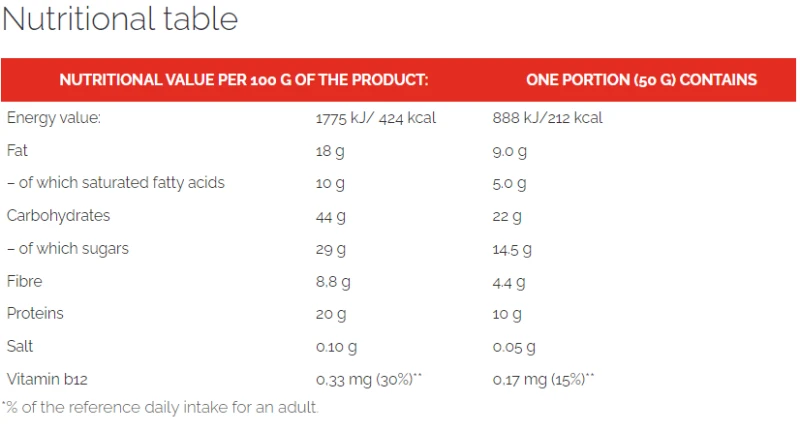 شوكولاتة 25% (كتلة الكاكاو، سكر، زبدة الكاكاو، مستحلبات: ليسيثين (صويا)، E492، نكهة الفانيليا الطبيعية)، مركز بروتين مصل اللبن WPC 80 (حليب) 23.7%، شراب الجلوكوز، إنولين، دهن النخيل غير المهدرج، عامل ثبات: المالتيتول. التوت البري المجفف المحلى 3٪ (التوت البري، قصب السكر، دقيق الأرز، زيت عباد الشمس)؛ مرطب: السوربيتول. توت غوجي مجفف 1,5%، مواد غنية: سترات المغنيسيوم، فيتامين C، النياسين، فيتامين E، حمض البانتوثينيك (B5)، فيتامين B6، الثيامين (B1)، فيتامين B12؛ مستحلب: الليسيثين (فول الصويا)؛ توابل.