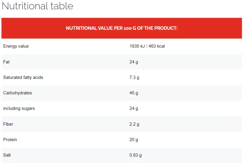 المكونات: الفول السوداني 24%، شوكولاتة الحليب 23% (سكر، زبدة الكاكاو، مسحوق الحليب كامل الدسم، كتلة الكاكاو، دهن الحليب اللامائي، مستحلب: الليسيثين (من فول الصويا)؛ نكهة الفانيليا الطبيعية)، شراب الجلوكوز، عزل الصويا، المحليات: المالتيتول؛ مرطب: الجلسرين. مالتوديكسترين، زيت دوار الشمس، بروتين مصل اللبن المعزول (الحليب)، 2.3% كراميل (سكر مكرمل)، سكر القصب، نشا التابيوكا، نكهة، ملح البحر، ملح، مستحلب: ليسيثين (فول الصويا).