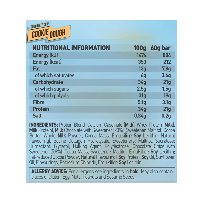 المكونات: مزيج البروتين (كازينات الكالسيوم (الحليب)، بروتين مصل اللبن (الحليب)، بروتين الحليب)، شوكولاتة الحليب مع المُحلي (20%) (المحلي: مالتيتول، زبدة الكاكاو، مسحوق الحليب كامل الدسم، كتلة الكاكاو، مستحلب: ليسيثين الصويا، طبيعي النكهة)، هيدروليسات الكولاجين البقري، المحليات: مالتيتول، سوكرالوز؛ مرطب: الجلسرين. عامل يستكثر: بوليدكستروز. رقائق الشوكولاتة مع مُحلي (5.8%) (كتلة الكاكاو، مُحلي: مالتيتول، مستحلب: ليسيثين الصويا، مسحوق كاكاو قليل الدسم، نكهة طبيعية)، بروتين الصويا، زيت الصويا، زيت دوار الشمس، منكهات، كلوريد البوتاسيوم، مستحلب: ليسيثين الصويا.