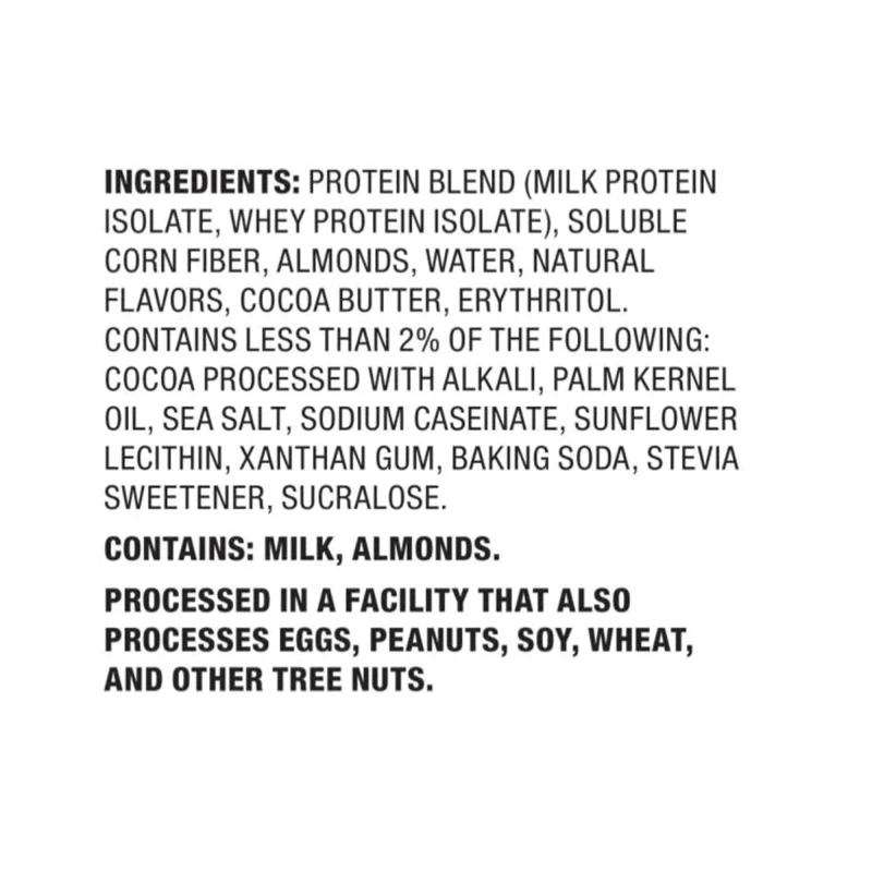 مزيج البروتين (بروتين الحليب المعزول، بروتين مصل اللبن المعزول)، ألياف الذرة القابلة للذوبان، اللوز، الماء، النكهات الطبيعية، زبدة الكاكاو، إريثريتول. يحتوي على أقل من 2% مما يلي: الكاكاو (معالج بالقلويات)، زيت نواة النخيل، ملح البحر، كازينات الصوديوم، ليسيثين دوار الشمس، صمغ الزانثان، صودا الخبز، مُحلي ستيفيا، سكرالوز.