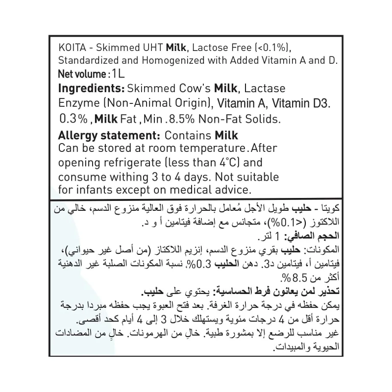حليب أبقار عضوي منزوع الدسم ، 0.3٪ دسم حليب ، كحد أدنى. 8.5٪ مواد صلبة غير دهنية