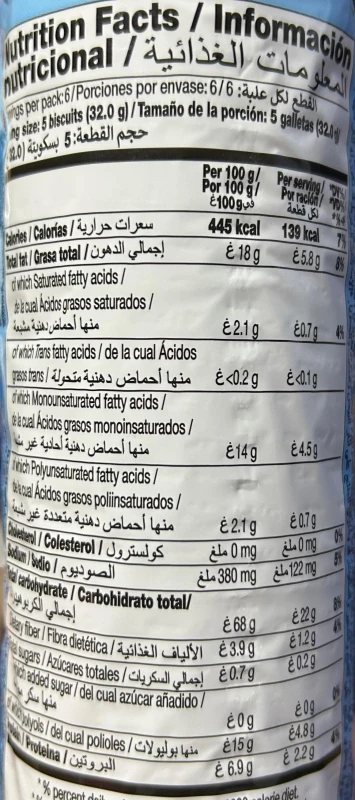 دقيق قمح مدعم بالفيتامينات والمعادن (دقيق قمح، نياسين، حديد، ثيامين، ريبوفلافين، حمض الفوليك)، زيت دوار الشمس عالي الأوليك 17%، مُحلي (مالتيتول 15%)، ألياف جذر الهندباء، ملح، مواد رافعة (بيكربونات الأمونيوم، بيكربونات الصوديوم)، مستخلص مالت الشعير، نكهات اصطناعية (فانيليا، زبدة)، مستحلب (ليسيثين الصويا)، مادة معالجة للدقيق (ميتاسلفيت الصوديوم).