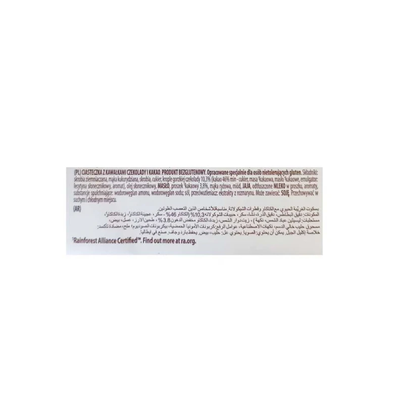 نشا البطاطس ، دقيق الذرة ، نشا ، سكر ، رقائق الشوكولاتة الداكنة 10.3٪ (كاكاو 46٪ كحد أدنى سكر ، معجون كاكاو ، زبدة كاكاو ، مستحلب: ليسيثين الصويا ، رائحة) ، زيت دوار الشمس 10٪ ، زبدة ، مسحوق كاكاو 3.8٪ ، أرز الدقيق والعسل والبيض ومسحوق الحليب منزوع الدسم والروائح وعوامل التخمر: كربونات حمض الأمونيوم وكربونات حمض الصوديوم ؛ الملح ومضادات الأكسدة: مستخلص إكليل الجبل